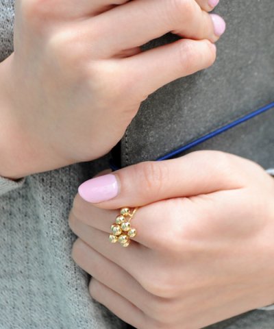 ブドウの様なつぶつぶとした小さなボールが可愛らしいモチーフのリング。リング部分にビーズ状のボールを通しているので手の動きに合わせてボールがシャラシャラと揺れ、華やかで軽やかな手元に見せてくれますまた、モチーフが指の根元を隠してくれるので指を細く見せてくれる効果も。周りと差が着く個性的なひと品です。