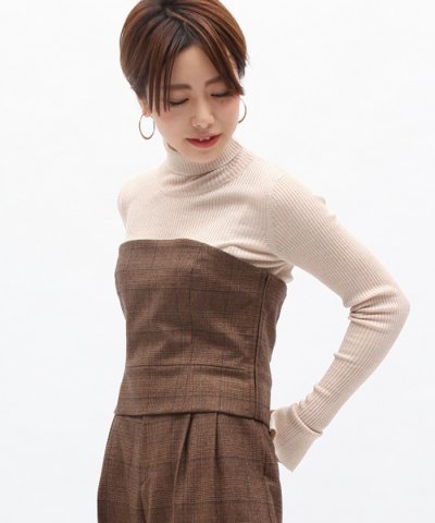 スタイルアップも叶えてくれるトラッドなビスチェ。セットアップでの着こなしもおすすめ。秋冬コーデに合わせたいグレンチェックのビスチェ。リブニットやラメニットなど今年らしいトップスにレイヤードさせてアクセント使いにすれば、トラッド感が上品に効いてグッとオシャレ感の高いスタイリングに。キュッとメリハリをつけたデザインなので細見せ効果もバツグンです。同素材でノーカラージャケットとワイドパンツもご用意しておりますので、3点で合わせたセットアップスタイルがおすすめ。
