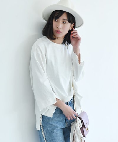 ダメージ加工がされた薄手のスウェットです。 くび元・袖口・裾にダメージ加工を施したUSED感のあるカジュアルデザイン。 たっぷりと身幅をとったルーズなシルエットですが、 薄手なのでだぼっと感なく着ていただけますよ。 袖口と裾のスリットが軽やかな印象に。 デニムやチノパンツとの相性が抜群です! また、甘めのプリーツスカートと合わせれば女性らしさをプラスした落ち感あるコーデも◎ 七分より少し長めの袖丈で手くびが見えるので、 バングルやブレスレット、トレンドのスカーフを巻いてたりと、アクセントになる小物を加えても素敵ですよ。