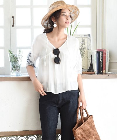 トレンドの刺繍が袖にほどこされたヘルシー感のあるフェミニンなブラウスです。 レーヨン楊柳生地を使用していて柔らかく体にソフトになじみます。 くび元についたタッセルは、垂らしたままでも、軽く結んでもくび元をきゅっと絞っても可愛いですよ。 シンプルにデニムと合わせるだけでも絵になる1枚です! ※透け感があるので、お手持ちのインナーをご着用下さい。