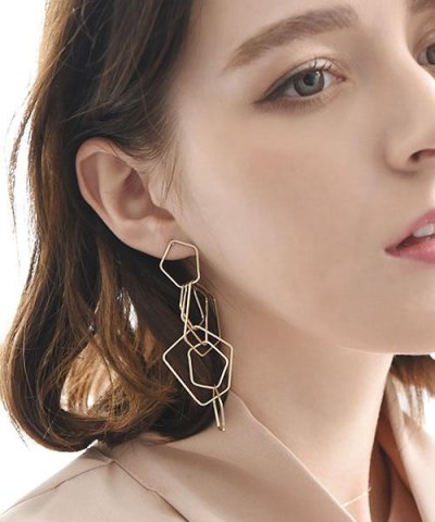 たくさんのスクエアパーツを組み合わせたロングピアスです。 ラインモチーフをたくさん組み合わせて縦に長く伸びるデザイン。 しっかりとした存在感なのに、とっても軽いんです。 顔回りがすっきり見えるのもポイント。 控えめな艶感でとても上品な仕上がりです。 モチーフ自体はシンプルなのに、華やかなのでオケージョンシーンにも使えますよ。