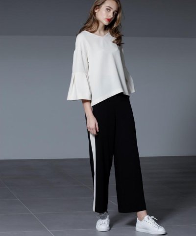 落ち感のきれいなトリアセジョーゼットを使用したパンツ。足を長くすっきり見せる、サイドライン切替が入ったデザイン。
